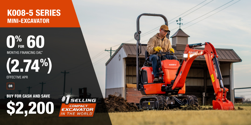Representative finance example for the K008-5: $36,821.58 financed at 0% (2.74% effective APR which factors in $2,200.00 in non stackable cash that cannot be combined with finance offers) equals $$552.59 monthly for 60 months. $3,683.90 down payment required. Cost of borrowing is $2,200.00 for a total obligation of $36,821.58. Financing available on approved credit. Prices and payments include freight and other applicable fees (including environmental fees, administration fees, set-up fees, and dealer fees on the model specified). Excavator Claim: "Kubota is the world’s #1 selling compact excavator for 20 years." Disclaimer: According to 2023 data from Off-Highway Research including all Kubota Group brand sales. Offer valid until 06-30-2026.
