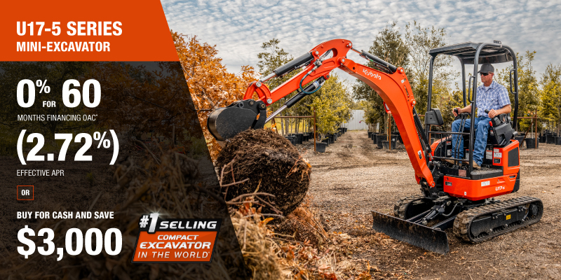 Representative finance example for the U17-5: $50,446.13 financed at 0% (2.72% effective APR which factors in $3,000.00 in non stackable cash that cannot be combined with finance offers) equals $757.05 monthly for 60 months. $5,047.02 down payment required. Cost of borrowing is $3,000.00 for a total obligation of $50,446.13. Financing available on approved credit. Prices and payments include freight and other applicable fees (including environmental fees, administration fees, set-up fees, and dealer fees on the model specified). Excavator Claim: "Kubota is the world’s #1 selling compact excavator for 20 years." Disclaimer: According to 2023 data from Off-Highway Research including all Kubota Group brand sales. Offer valid until 06-30-2026.